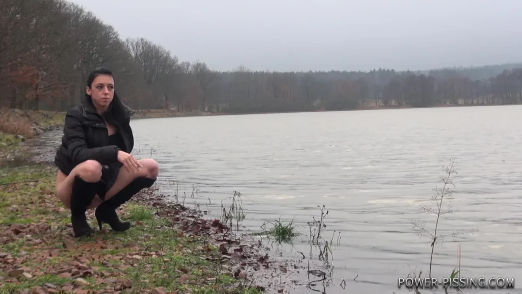 Annie’s out in the middle of nowhere, crouched at the edge of a lake in a black jacket and boots, thick brunette hair cut short. She’s got that slim build, not too tall, looks like she’s in her mid-20s. Frame by frame you see her squat down, hands on her thighs at first, then pulling her pants down just enough to expose her ass. No teasing — she goes right into it, piss streaming out continuously, the angle showing every second of it from the side. The lighting’s natural, full daylight, not filtered or edited — looks completely real. You can see the water hitting the ground, how she shifts slightly to let it flow better. Background’s just trees and open water, totally isolated. Nothing fake about it, no music, no cuts — just a girl pissing outside like no one’s watching. The whole thing feels spontaneous, like she didn’t plan it but just had to go and didn’t care who saw. Camera holds steady the whole time, medium shot focused on her lower half but still catching her face in profile. It’s not sexy in a traditional way, but it’s raw and unfiltered, the kind of thing most sites fake with bottles or edits. This isn’t that. She flushes the whole thing out in one go, stands back up, pulls her pants up, and that’s it. Ends as abruptly as it started.