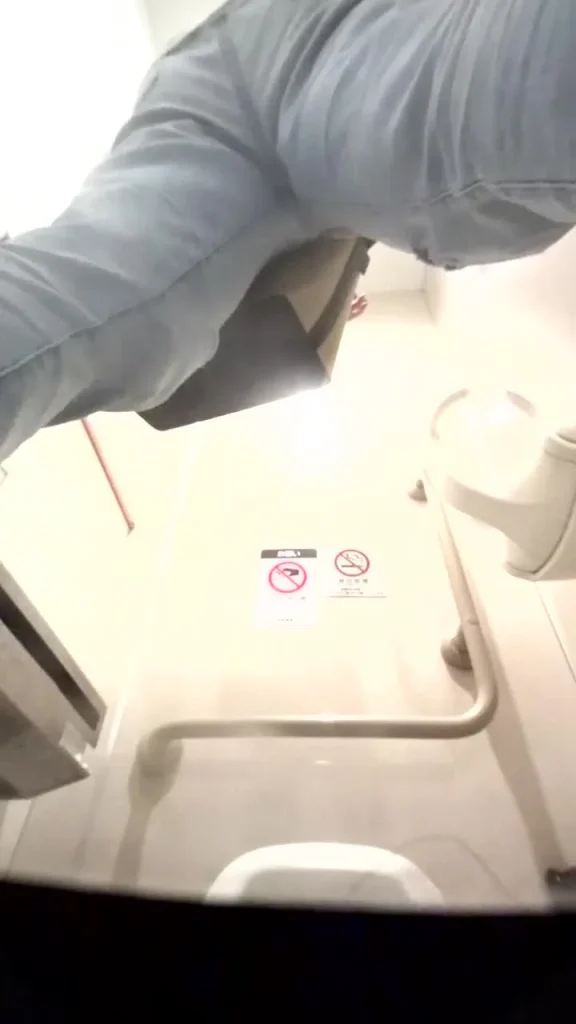 In this explicit scene, a young Asian woman with long black hair and a slim figure is seen squatting over a toilet with her butt exposed. She is wearing a watch on her wrist and has a ponytail in some shots. A young Asian man with a muscular build and black hair joins her, also exposing his butt. The scene takes place in a bright bathroom with a trash can nearby, captured in a close-up POV shot. The couple engages in exposure acts, showcasing their bodies in a unique setting.