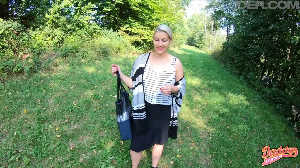She’s walking through a park in daylight, wearing a black and white striped shirt and a short skirt, carrying a bag like she’s just out for a casual stroll. Doesn’t look like she’s headed for anything wild — until the camera gets low and you see her bare ass in the grass. Next thing you know, some guy’s pissing on her from behind while she’s bent over, face in the grass, taking it without flinching. The piss runs down her back and into the crack of her ass before he flips her skirt up and starts fucking her hard in doggy. She’s not talking, not really reacting — just letting it happen, kind of empty-eyed, like this is just another part of her day. The angle on the creampie is close-up and messy, one long take with cum dripping down her thigh as she pulls her skirt back down. Whole thing feels spontaneous, almost too real — like someone filmed it without setting anything up. No music, just natural sounds, the occasional bird, her breathing. The blonde’s got that thick-yet-curvy build, mid-30s look, not a teen but not old either. Her shirt stays on the whole time, which makes it weirder — she looks halfway professional, like she came from work. Camera stays handheld, mostly medium shots until it goes in close for the cumshot. No fancy lighting, no edits — just straight-up public degradation with a rough finish.