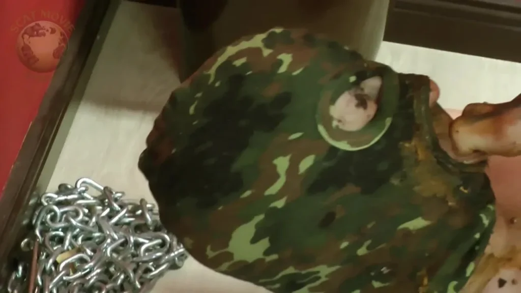 The video starts with a guy squatting on the floor, actively taking a shit. You see his bare ass and the pile forming underneath him, close enough to make the detail clear — it’s not faked. He’s got tattoos on his legs and feet, muscular build, wearing a green camo mask in later shots. A woman stands next to him, barefoot or nearly barefoot, slim, white, not doing much but watching or just being present. The room has a red wall, dim lighting, shadows, chains on the ground — looks like a dungeon or fetish playroom. Camera stays tight on the floor, feet, and genitals, with several close-ups showing the mess and their positioning. The whole thing feels raw, not performative — like it’s meant to focus on the act itself, not facial expressions or erotic buildup. Later frames show them both standing near the feces, feet visible, no cleanup happening. The overhead shot captures the chain on the floor and the guy’s masked head, adding to the fetish vibe. There’s no sex, no oral, no penetration — just the scat element and the atmosphere. The lighting keeps things shadowy but not blurry, so you see the textures well. Nothing glamorous here. It’s straightforward, intense, and definitely niche.