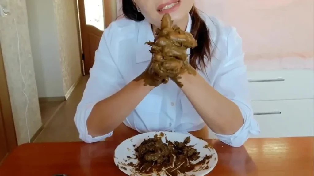 LinaScat, a slim Asian teen with long straight dark hair and bangs, starts off holding a huge greasy chunk of something fried—looks like chicken—dripping with thick brown sauce. She’s in a casual indoor setup, probably a kitchen or dining area, warm daylight hitting her face as she brings it close to her mouth, smearing sauce on her lips like she’s about to bite down. But she doesn’t eat it clean. Instead, she licks the goo off her fingers one by one, staring into the camera, hands slick with it. The food gets broken apart on a plate, pieces scattered, chocolate or whatever it is smeared all over her face and hands. She’s smiling the whole time, playful and fully into the mess, like she’s getting turned on by the stickiness. The camera stays tight—medium close-ups, frontal shots—focusing hard on her face and hands, making the whole thing feel personal, almost like she’s teasing you with every lick and smear.