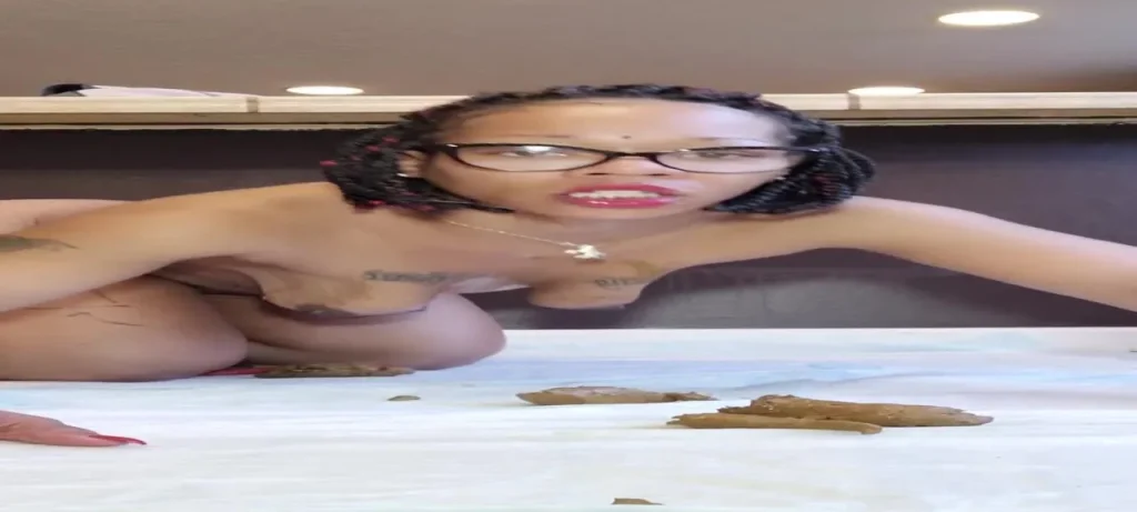 UniQueen21 is on all fours, her thick black braids swinging as she squats over the mattress and starts pushing out a chunk of shit. You see it hit the sheets—brown, soft, and unmistakable—right before she reaches back and spreads her pussy open with her red-nailed fingers. She’s got glasses, tattoos, and full curves, red lipstick still perfect as she rocks back on her knees and lets the camera catch every inch of her exposed hole. No partner shows up—this is solo scat, straight and dirty, with tight close-ups when she’s smearing it with her fingers. The angle stays low and centered, never cutting away, just holding on the mess as she moves through it. Lighting’s flat and bright, no shadows hiding a thing. She stays in the same bedroom the whole time, never changing clothes or cleaning up, just working her body and letting it all hang out.
